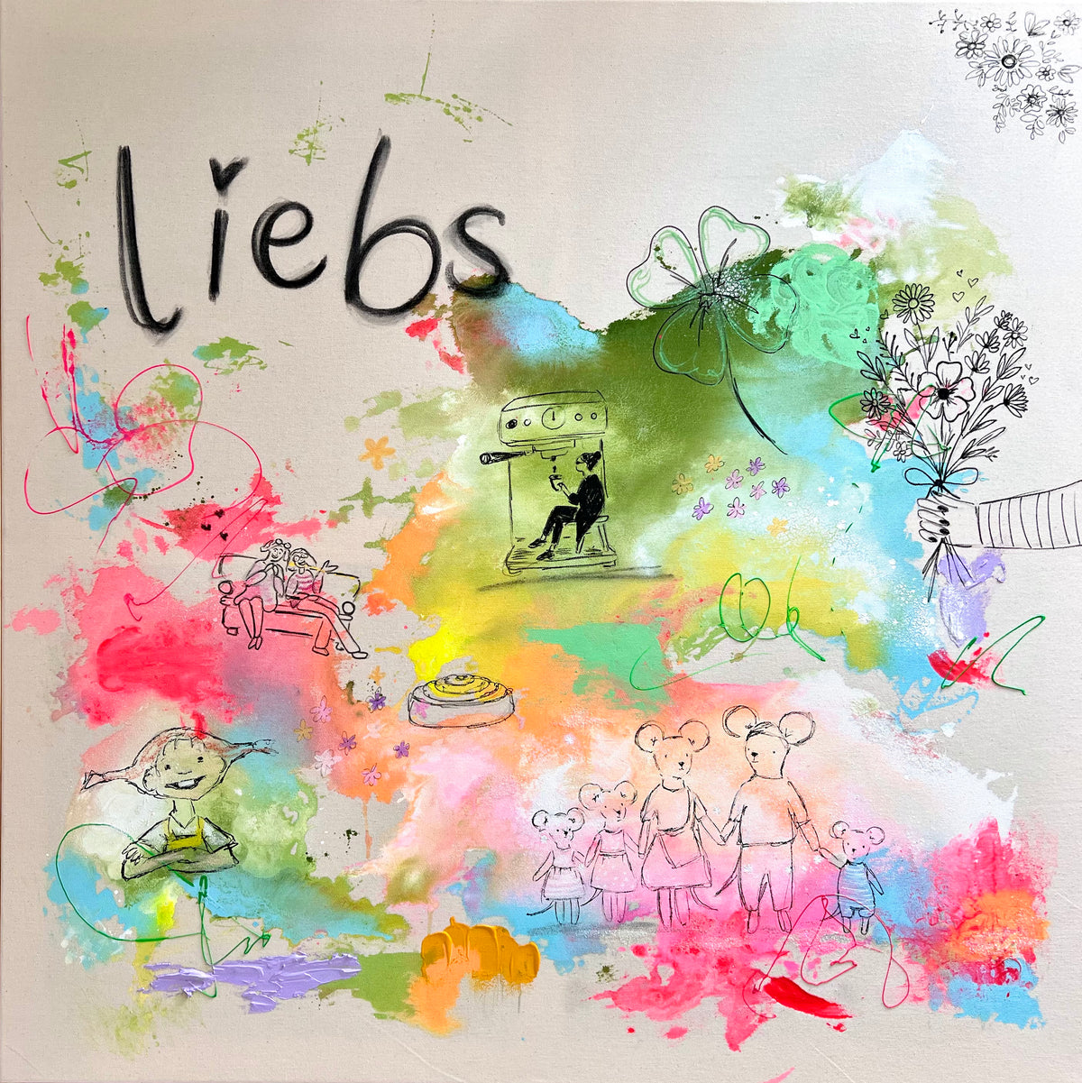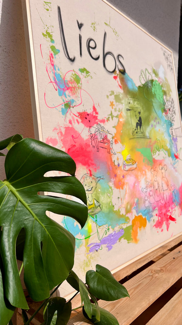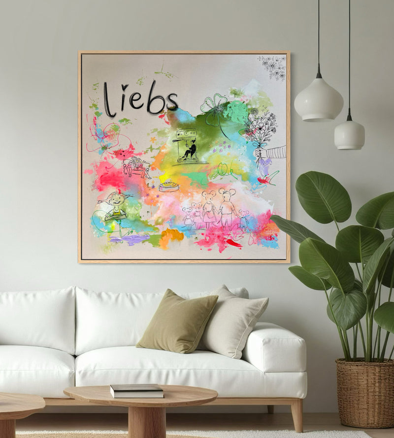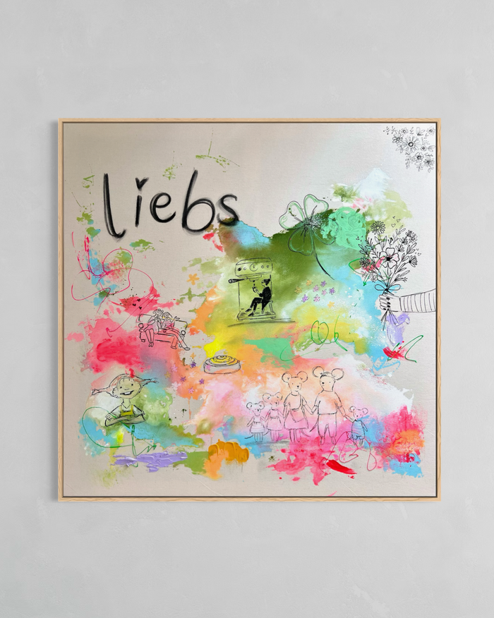 So bunt wie das Leben selbst – und so einzigartig wie eure Geschichte. Ein 100 × 100 cm Unikat auf handbespannter Naturbaumwolle, mit den Symbolen, die eure Familie wirklich ausmachen. Handgemalt, nur einmal, nur für euch.